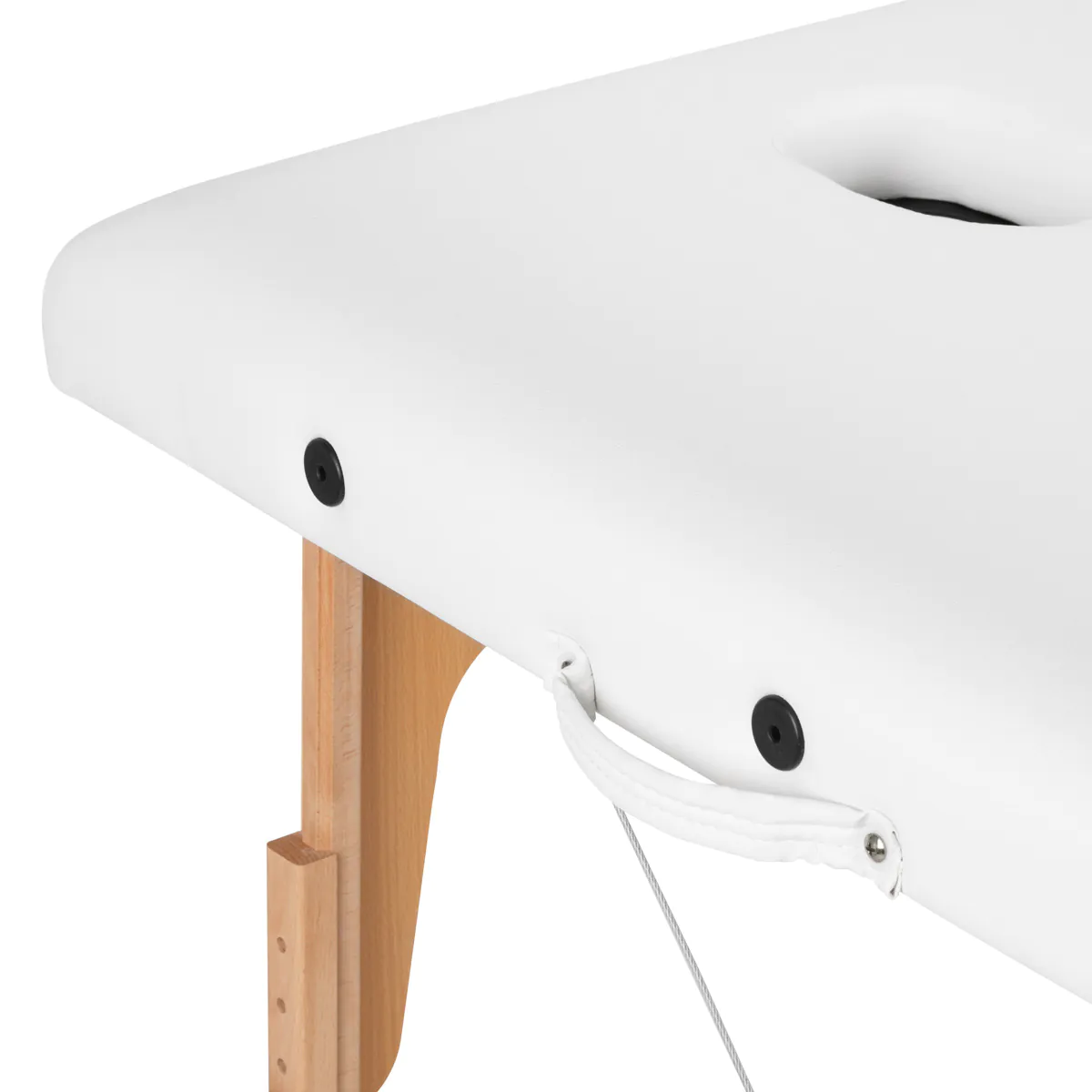 Στιβαρή Κατασκευή & Απόλυτη Σταθερότητα Κάθε πόδι αποτελείται από δύο τμήματα που ασφαλίζουν με ειδικές λαβές (knobs) στις αντίστοιχες οπές, διασφαλίζοντας ότι το κρεβάτι παραμένει ακλόνητο. Επιπλέον, ο ξύλινος σκελετός είναι ενισχυμένος με ατσάλινα καλώδια (metal cables), καθιστώντας το κρεβάτι εξαιρετικά συμπαγές και κατάλληλο για ένα ευρύ φάσμα υπηρεσιών – από τοποθέτηση βλεφαρίδων μέχρι απαιτητικές συνεδρίες μασάζ.